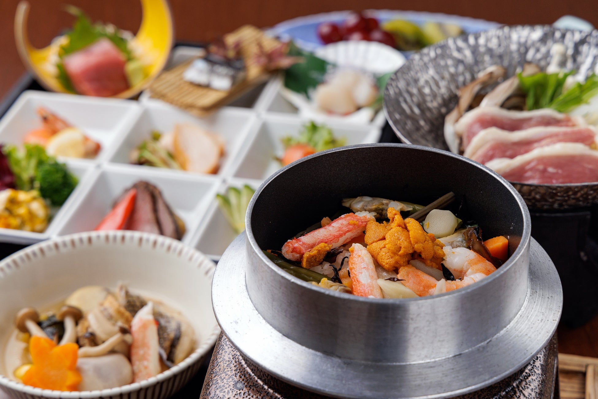 釜飯は海鮮釜めしまたは牛釜めしよりお選びいただけます。