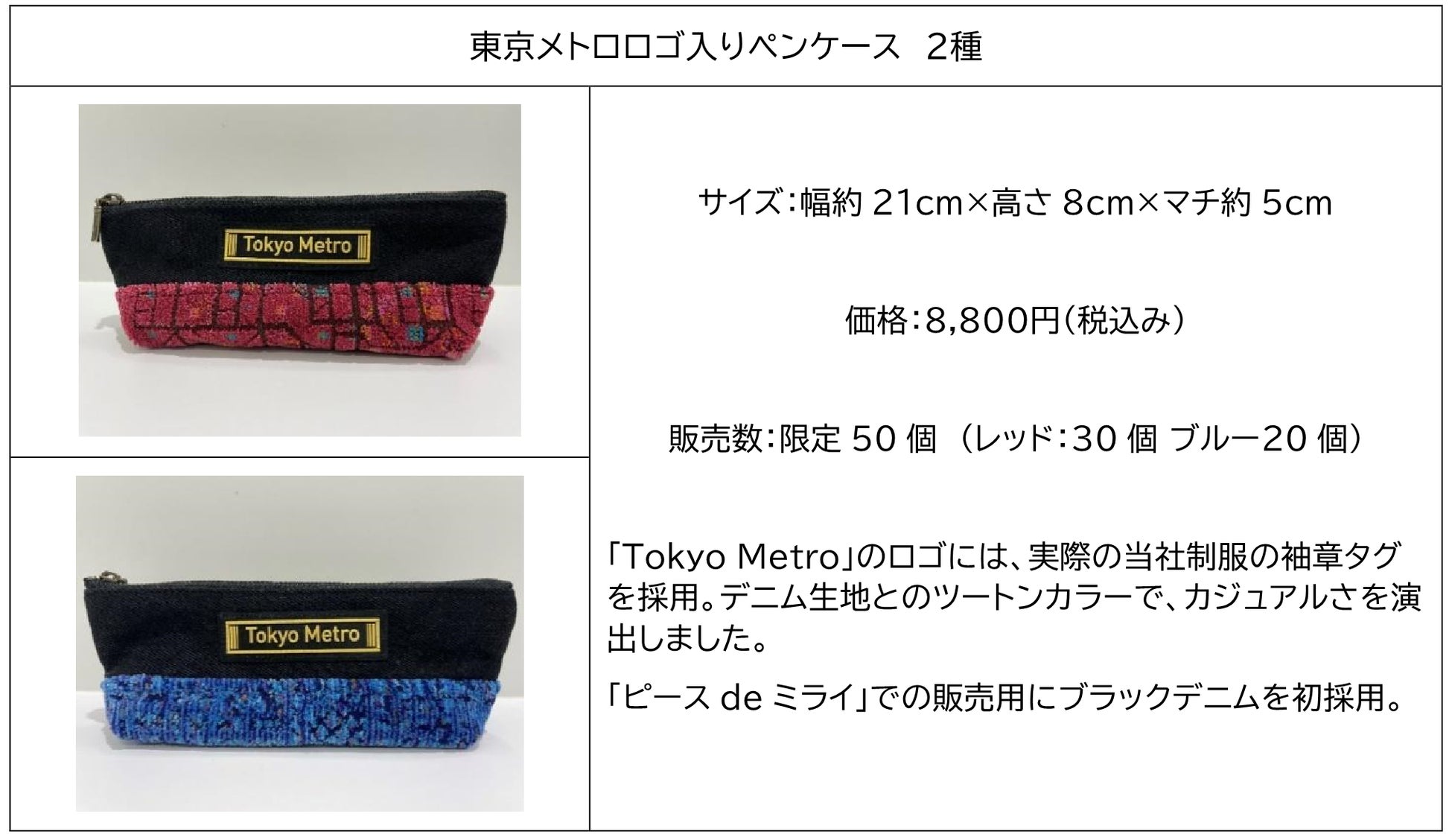 今回販売する商品は、その第一弾商品をベースに、丸ノ内線02系の座席シートと当社制服に採用される袖章タグを活用しつつ、ピース de ミライ特別バージョンとして、新たにブラックジーンズ生地を組み合わせ、数量限定で製作した「東京メトロロゴ入りペンケース」です。