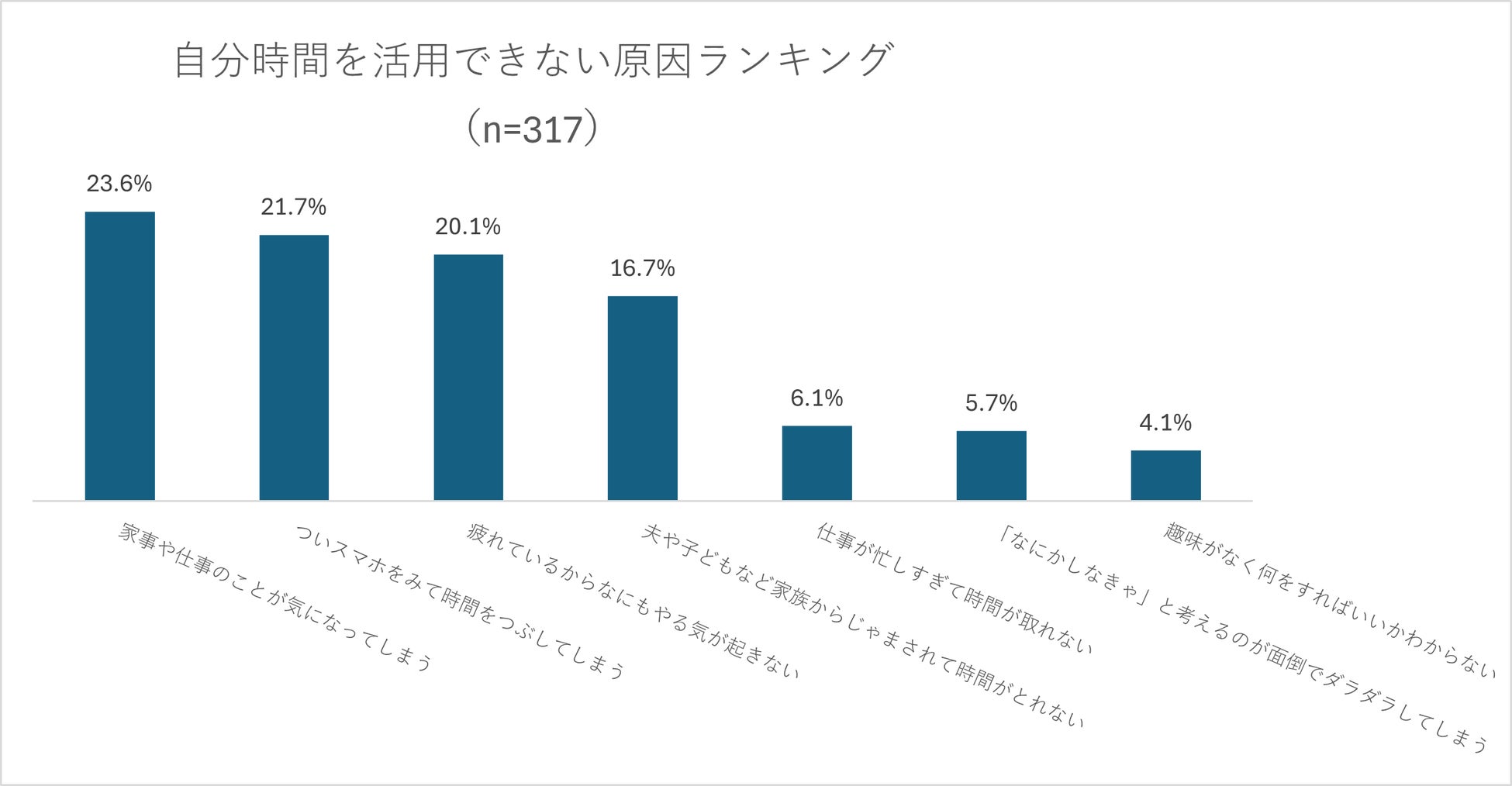 自分時間が活用できない原因の1位は「時間があっても、家事や仕事のことが気になってしまう」、2位に「ついスマホでSNSをみて時間をつぶしてしまう」が続きます。仕事や家事、そして子育てを同時にこなす人も少なくない現代ならではの悩みも多い様子。「疲れているからなにもやる気が起きない」は3位に。
