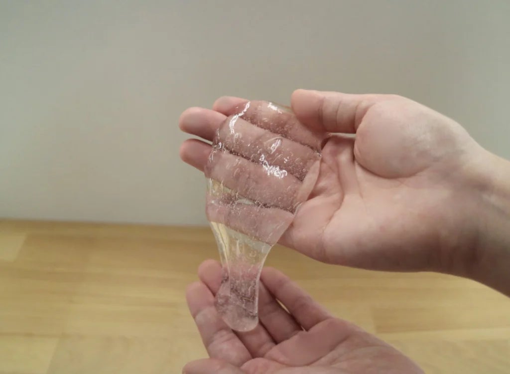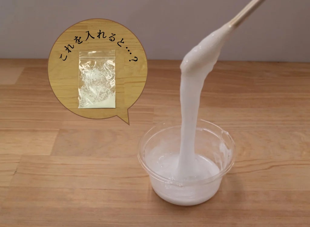 スライムをつくるには、洗濯のりに含まれている成分である「PVAのり」と、乾燥剤などにも使われる天然鉱物を水に溶かした「ホウ砂水溶液」を使います。2つの材料を混ぜ、やさしくこねてみると、ぷるぷるとした感触のスライムができ上がります。