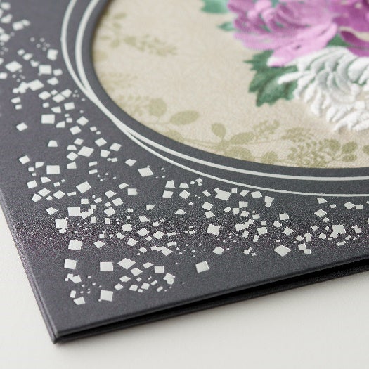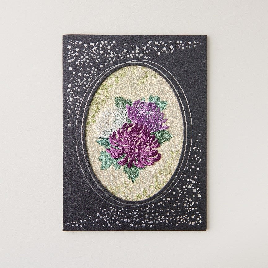 本商品は、大きく花びらを広げた3輪の菊を、美しい刺しゅうで表現した電報台紙です。