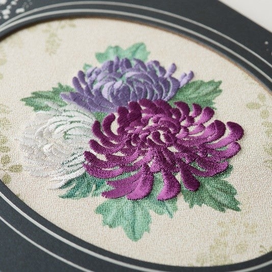 3輪の菊の刺しゅうには、濃紫、薄紫、白の糸を使用し、上品な色合いに仕上げました。