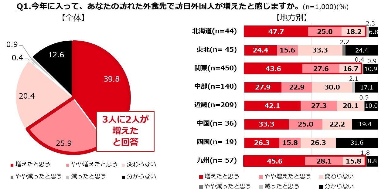 ・外食先で訪日外国人が増えたと思う人は3人に2人(66%)で、北海道、関東、九州では5ポイント以上高い7割強。