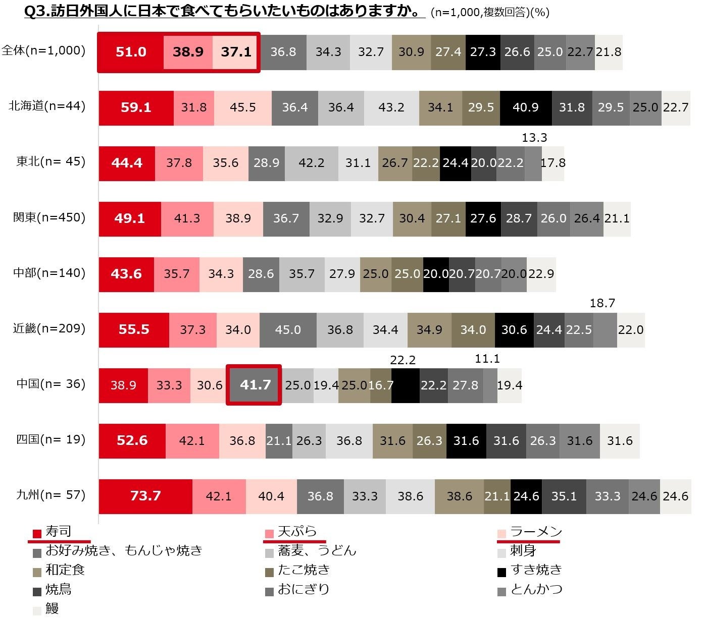 ・訪日外国人に食べてもらいたいものも「寿司」が1位で、「天ぷら」「ラーメン」が続く。中国地方では「お好み焼き」が1位と、地域性も出る結果に。
