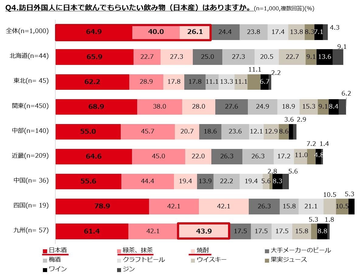 ・訪日外国人に飲んでもらいたいものは「日本酒」が1位で、次いで「緑茶、抹茶」。九州では「焼酎」が2位。