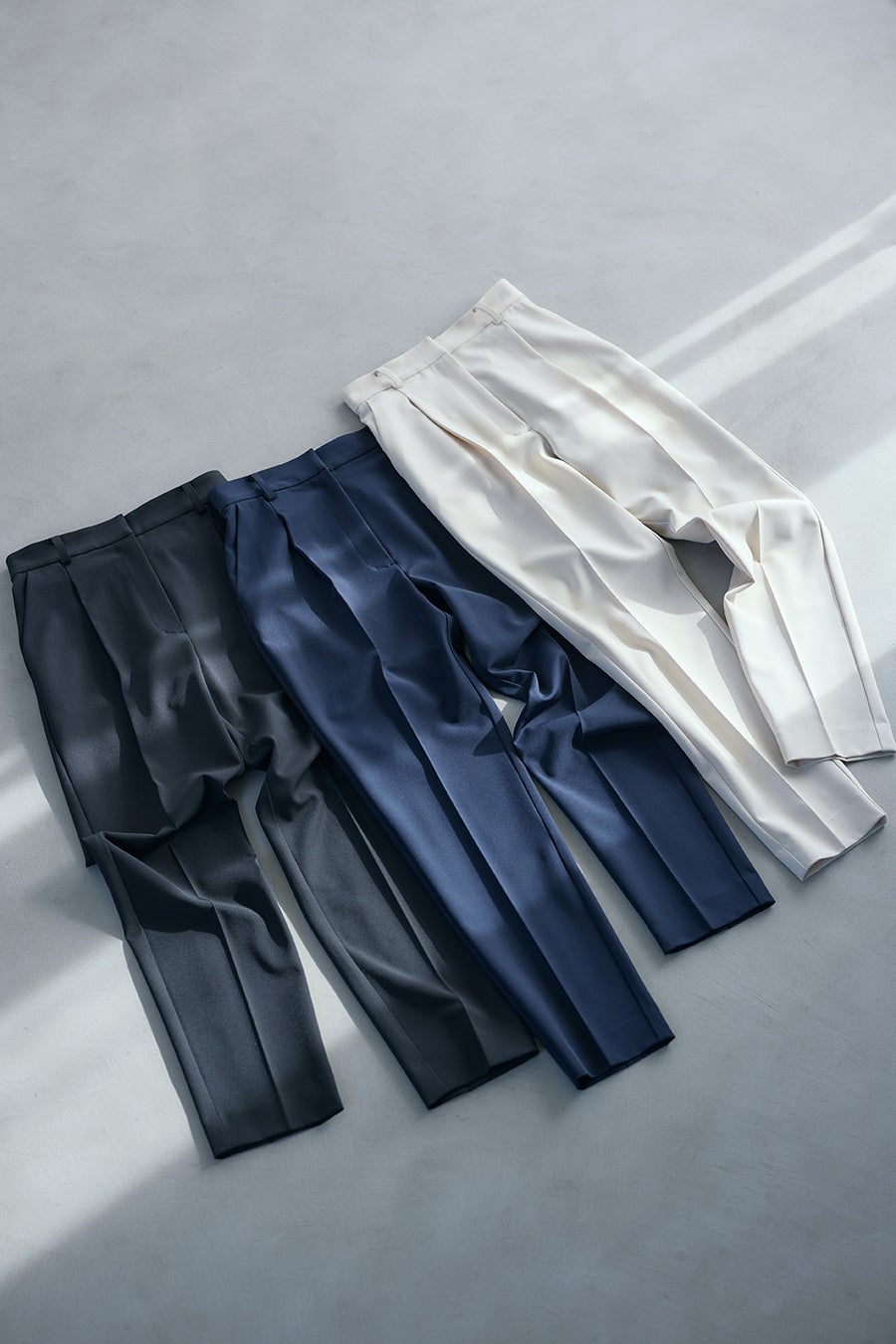 後ろウエストゴム仕様で、長時間のデスクワークも楽ちんに過ごせ、腰回りはゆったりとしているが、ジレと合わせてすっきり見える裾幅にこだわりました。センタープレスもスタイルアップ効果を忍ばせています。