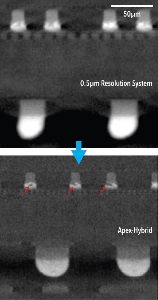 半導体バンプサンプルの比較画像です。空間分解能500nmのX線CT装置と比較して、ApexHybrid-200TMでは、高い空間分解能により、斜入射モードで検出されたバンプの欠陥が明瞭に観察出来ます。