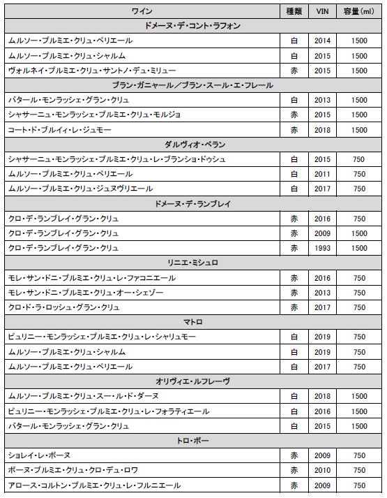 ※プルミエ・クリュ以上で容量750ml(フルボトル)以上のブルゴーニュワイン(赤または白)。銘柄やヴィンテージは問わない。