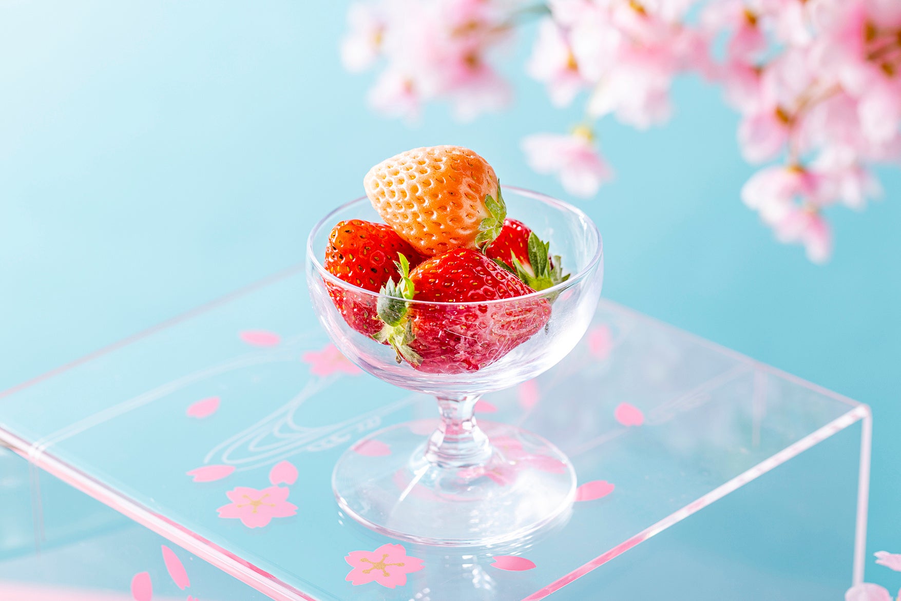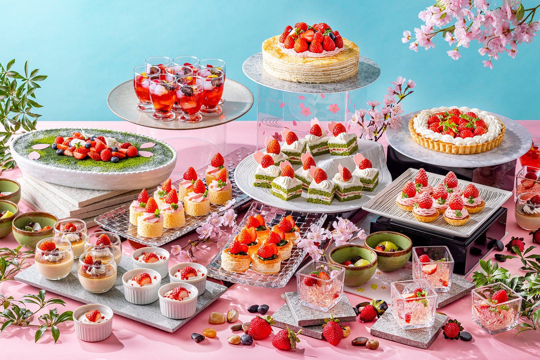 いちごのミルクレープ 桜のクリーム、いちごとルバーブのタルト、いちごと抹茶のティラミス、いちごとよもぎのショートケーキ、いちごと桜のロールケーキ、いちごと抹茶のパイ、いちごのモンブラン、いちごあんみつ、