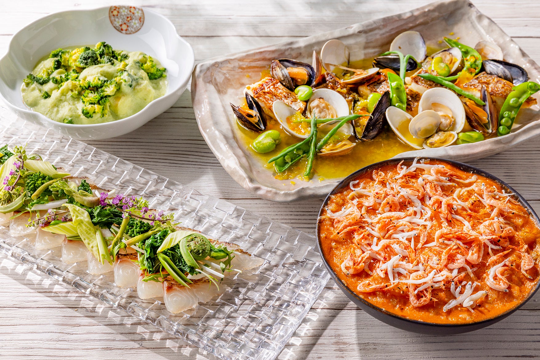 桜トラウトのロースト 黒ニンニクソース、蒸し野菜と農園直送野菜 カロテンドレッシング、魚介のブイヤベース 緑豆3種、チキングリルと新玉ねぎ 瀬戸内レモンソース、ポークロース 鹿児島産黒酢煮込み、あんかけ蟹ピラフ または シラスと桜海老のマック&チーズ、ニョッキ ブロッコリーソース または ラヴィオリ ホタルイカ トマトソース、鴨のローストと京野菜 ソース オ ビネーグル(ディナーのみ) など