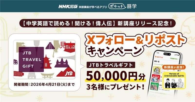 NHK英語講座を1日5分から手軽に学べる英語学習アプリ「ポケット語学」が、X公式アカウントにてキャンペーンを実施中! 期間は2026年4月7日(火)12:00~4月21日(火)23:59。