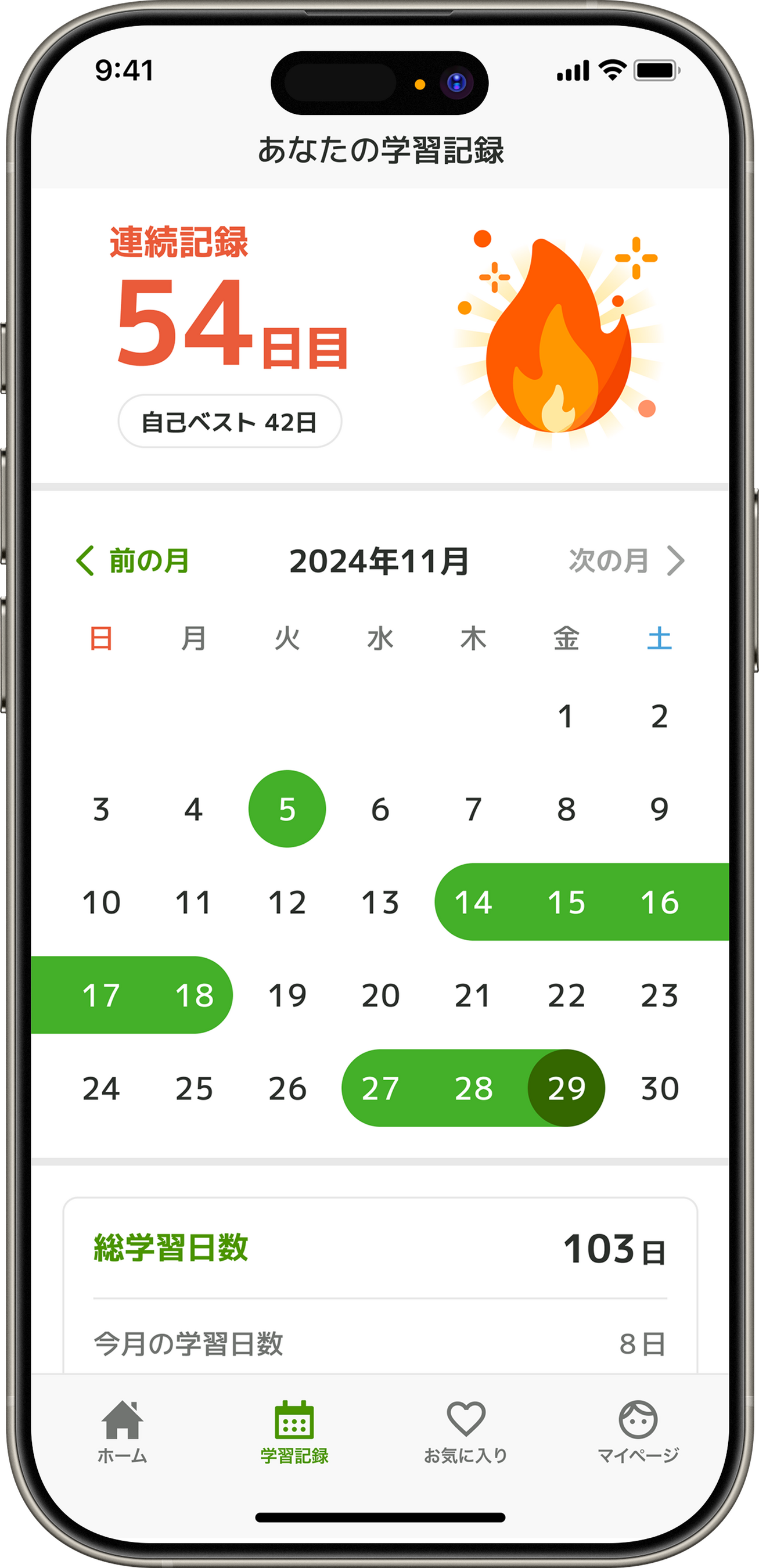 「あなたの学習記録」として、学習連続記録日数(自己ベスト日数)、総学習日数・学習時間が表示されます。 これまでの積み重ねが楽しいビジュアルで可視化され、モチベーション管理に役立ちます。