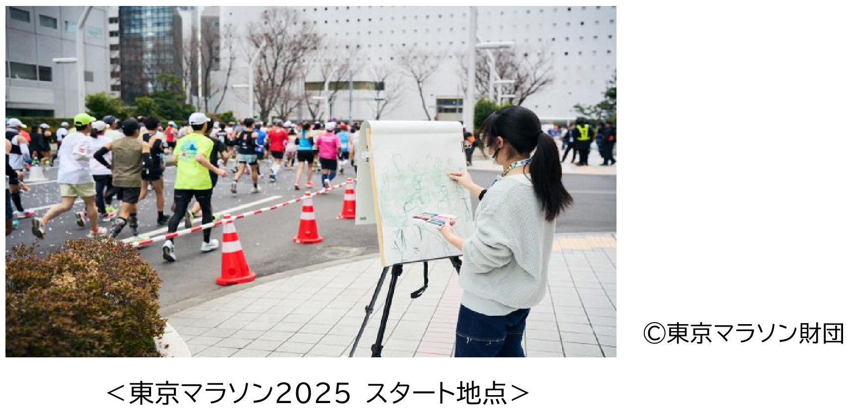 先日開催された東京マラソン2025(※1)の当日、東京藝術大学の学生(アーティスト)がスタート地点にてランナーのスタートしていく様子や会場の雰囲気を描いたクロッキー(※2)を、銀座駅構内において、期間限定で展示いたします。ぜひ、学生アーティストの作品をご覧ください。