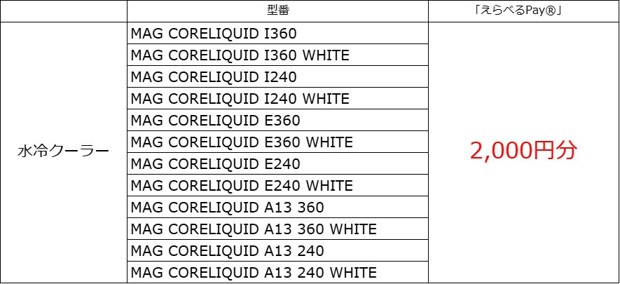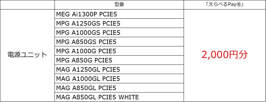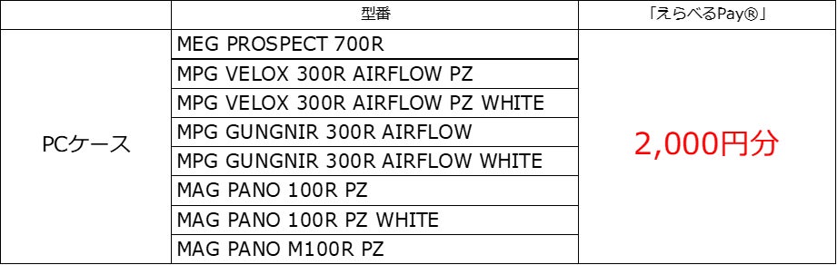 対象のMSI簡易水冷クーラー、PCケースおよび電源ユニットを購入後、正規販売店ECサイトもしくは価格.comなどの指定サイトにてレビューを投稿していただいたお客様全員に1製品ごとに2,000円分の「えらべるPay®」をプレゼント!
