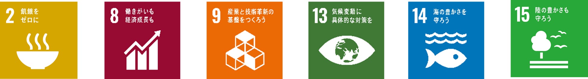 今回ご案内の取り組みは、SDGsの17のゴールのうち、特に2番、8番、9番、13番、14番、15番に貢献するものと考えています。