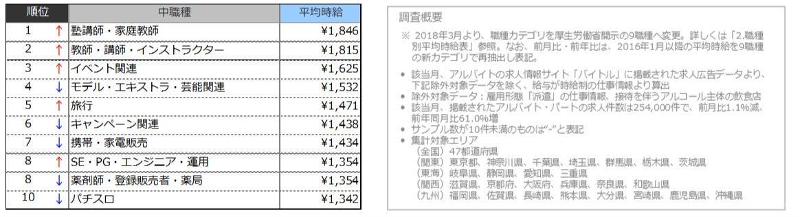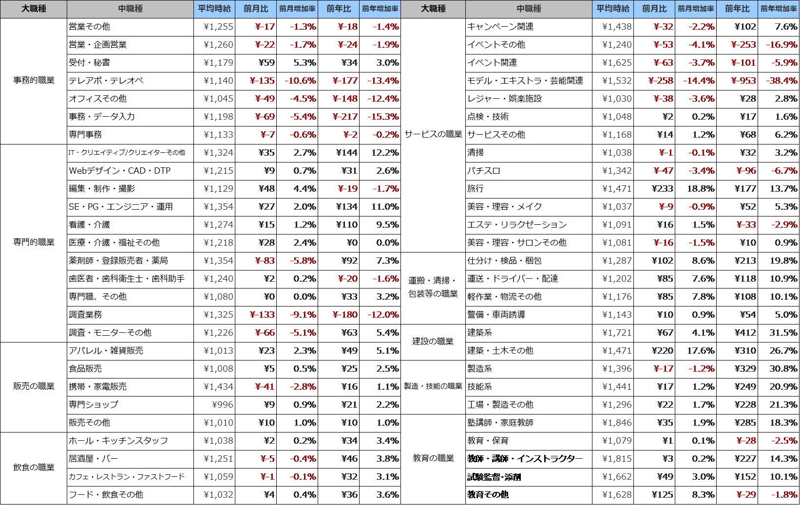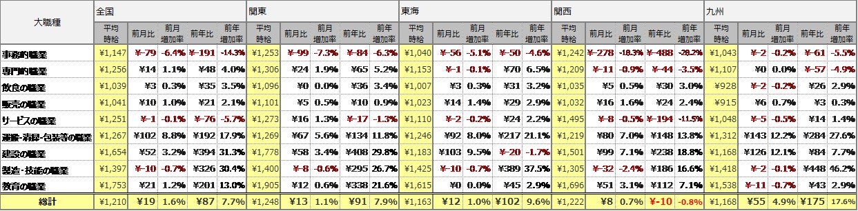 関東エリアの平均時給は1,248円(前月比13円増、前年比91円増)、東海エリアの平均時給は1,163円(前月比12円増、前年比102円増)、関西エリアの平均時給は1,222円(前月比8円増、前年比10円減)、九州エリアの平均時給は1,168円(前月比55円増、前年比175円増)となりました。