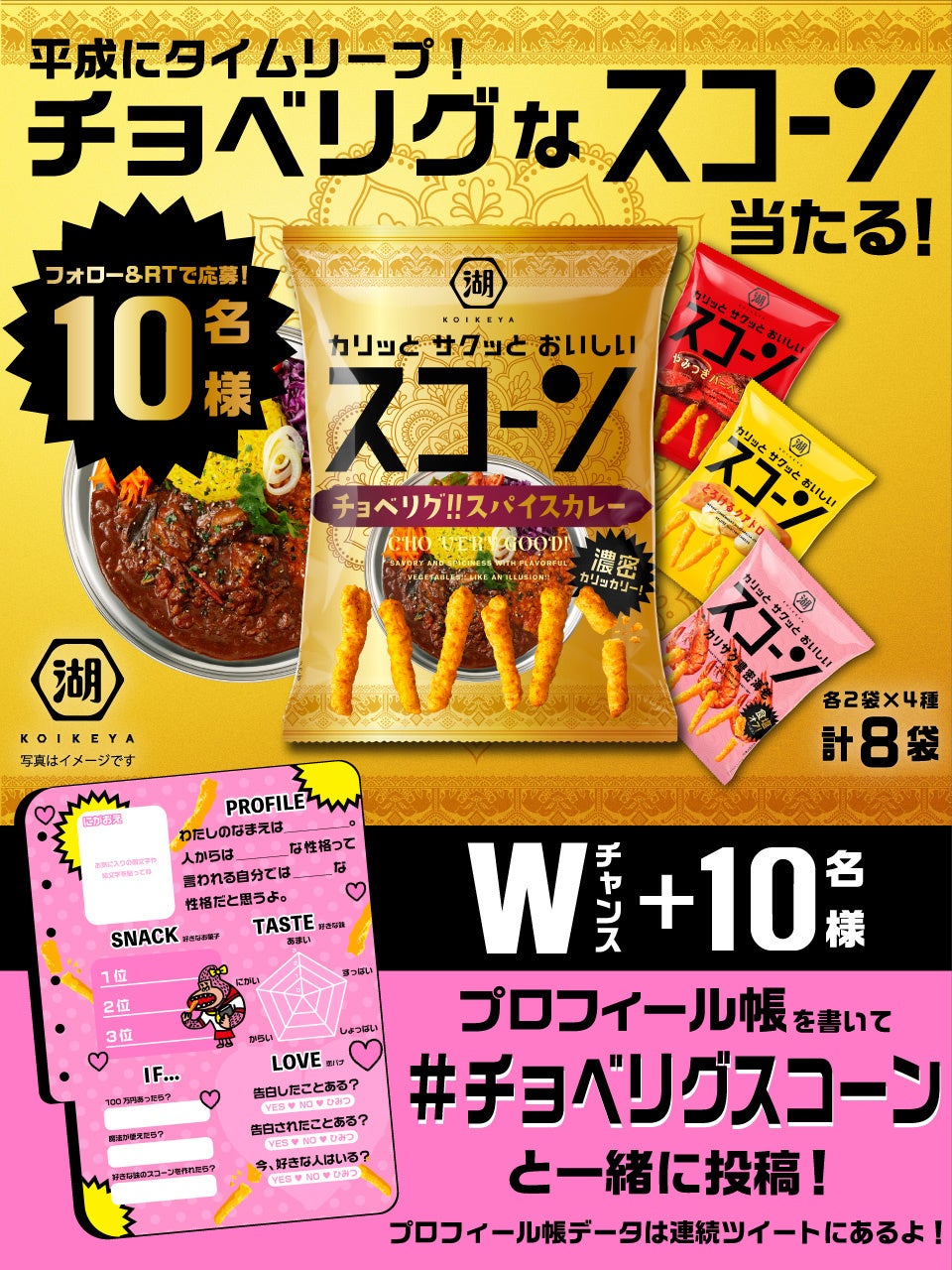 新商品「スコーン チョベリグ!!スパイスカレー」の発売を記念し、当商品を含む「スコーン」4品(合計8袋)を抽選で10名様にプレゼントするキャンペーンを実施します。Twitterのフォロー&リツイートで簡単応募のキャンペーンですが、特製プロフィール帳を記入して「#チョベリグスコーン」をつけて応募すると、さらに+10名様に当たりますので、ぜひご参加ください。