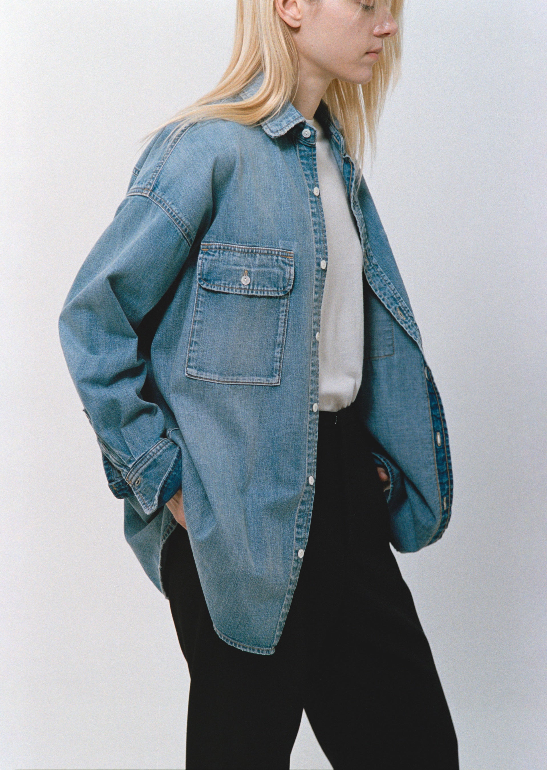 本別注は、SALON adam et rope'のためにセレクトした“ウォッシュインディゴ”のカラーリング。深みがありながらも重くなりすぎない色合いは、本格的なヴィンテージデニムの表情を持ちつつ、クリーンで洗練された印象に仕上げています。絶妙な太さできれいな落ち感が魅力のストレートデニム「Dakota(ダコタ)」は、 腰を落として穿いているようなラフさは残しながらも、程よくフィットするウエスト設計。脚が綺麗に見える股位置と太さにこだわり、美しいストレートラインを実現しました。メンズライクなビッグシャツは、一枚でも、羽織としても様になるサイジングで、同色のデニムパンツとのセットアップスタイルも楽しめます。