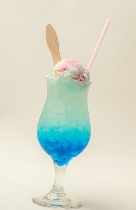 甘酸っぱいレモネードのクリームソーダ。ステージ予感させるブルーライトなレモネードにパステルカラーが鮮やかに混じりあうダンサブルなアイスをトッピング。
