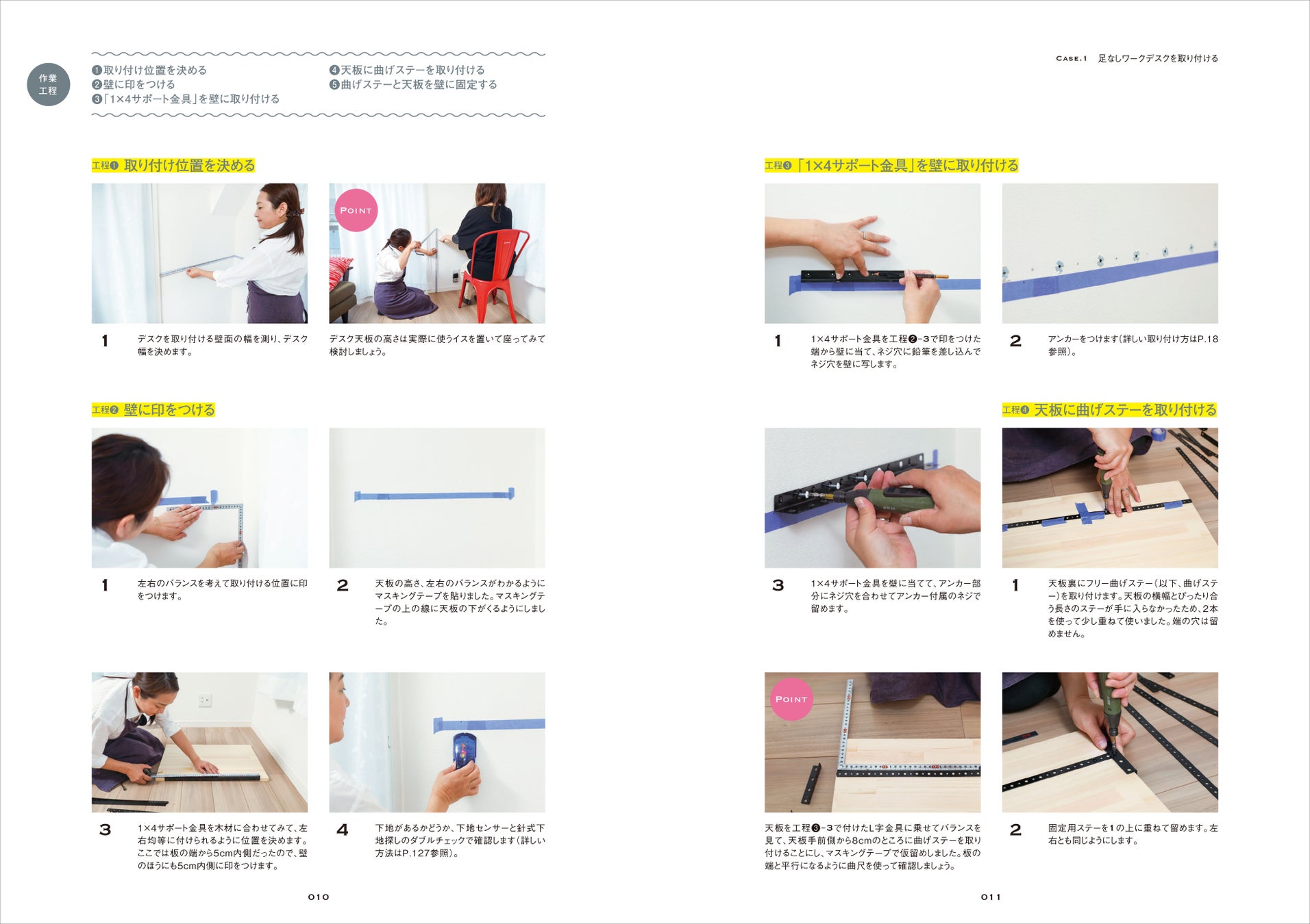 幅の狭い壁に足なしデスクを作りつけることから始まり、下駄箱下の空いているスペースにぴったりの収納ボックスを作る、ベランダ用テーブルを作る、玄関前に子供の遊具をハンギングできるようにする、階段の踊り場に趣味兼書斎スペースをつくるなどなど、前半は初心者でも挑戦できるテクニックの組み合わせで、ガラッと不便を解決した実例が並びます。