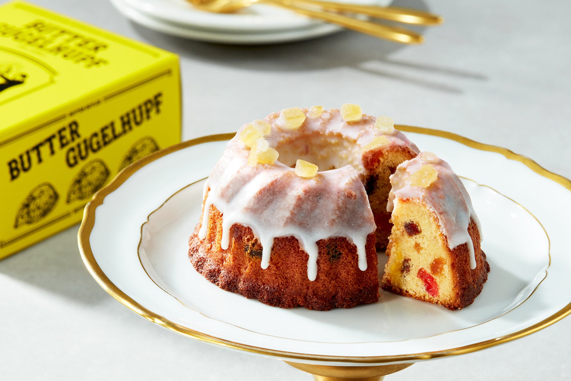 シナモンやナツメグなどのスパイスが、より一層華やかにバターのコクを引き立てる上品な仕立てでご用意したバタークグロフ。生地には、ラム酒漬けのオレンジ、レーズン、チェリーなどのドライフルーツを混ぜ込んでおり、カットした断面も色鮮やかに、目でも楽しめる一品でございます。表現のグレーズと、レモンピールが味わいと見た目に彩りを添える、バターバトラー自信作をぜひご賞味ください。