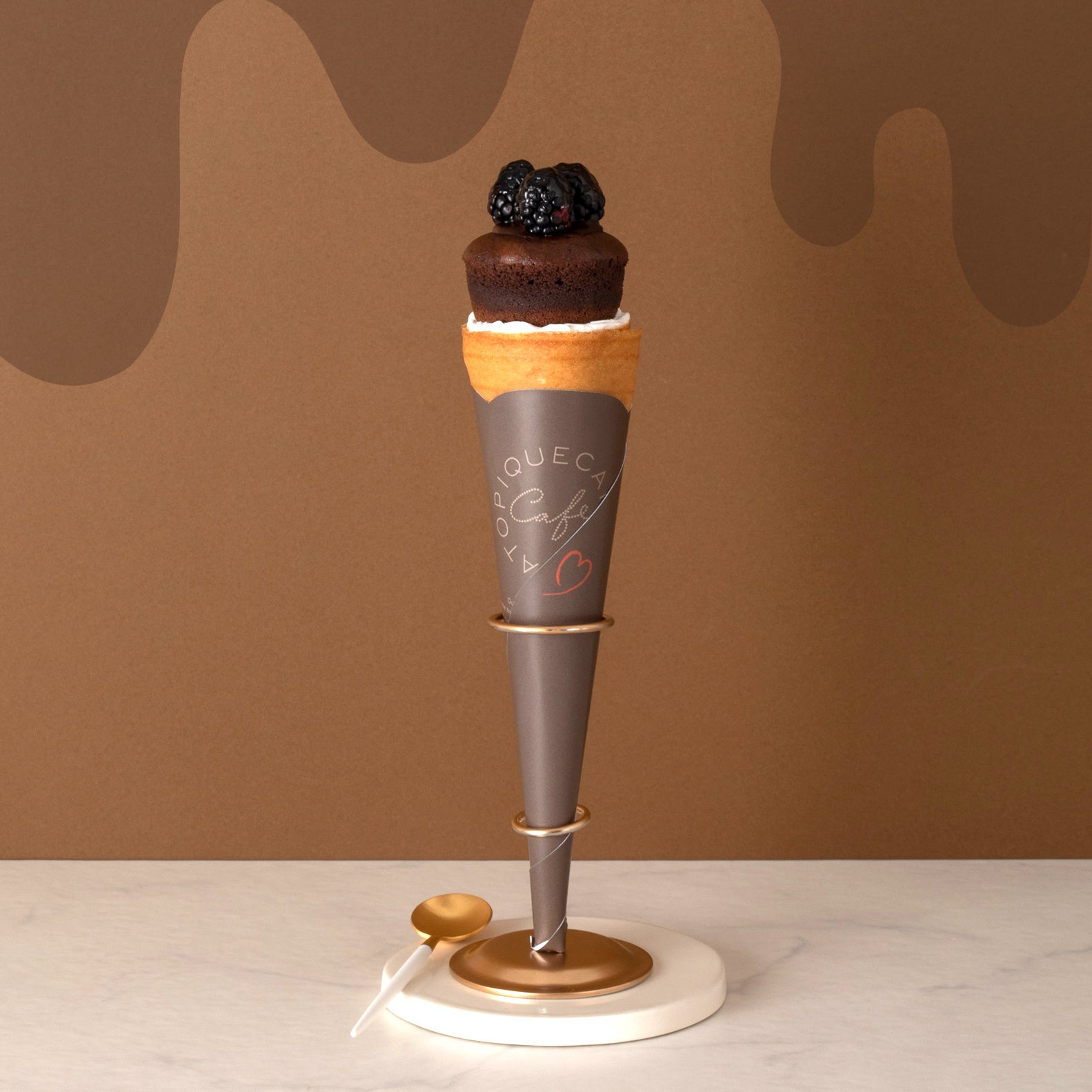 中から温かいチョコソースがとろけだすフォンダンショコラをトッピングしたクレープ。中にはカカオの風味がリッチな味わいのチョコレートホイップと甘さを控えめにしたホイップにロイヤルブルボンジェラートを合わせ、アクセントにブラックベリーとカシスのソース、クランキーな焼きビスケットが入ったキャビアチョコを組み合わせました。様々なチョコが一つになったリッチなチョコの味わいを最後までお楽しみいただけます。