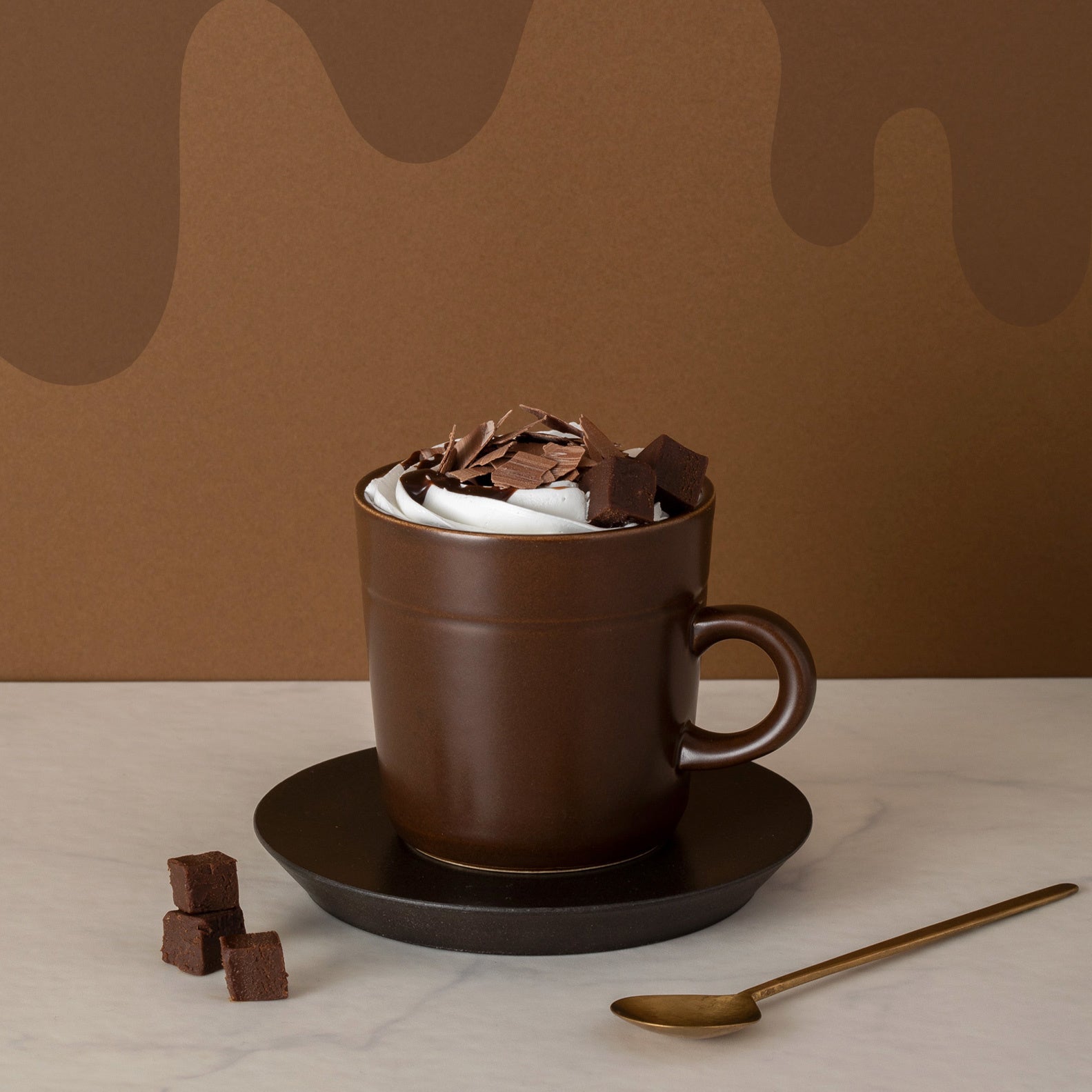 焙煎したカカオの風味が楽しめるエキストラダークチョコレートに、同じくカカオ分の高いダークチョコレートを合わせ、コク深い、甘さ控えめのホットチョコレートに仕上げました。トッピングには甘さを控えめにしたホイップと生チョコ、ミルクチョコ、チョコソースを使用しています。