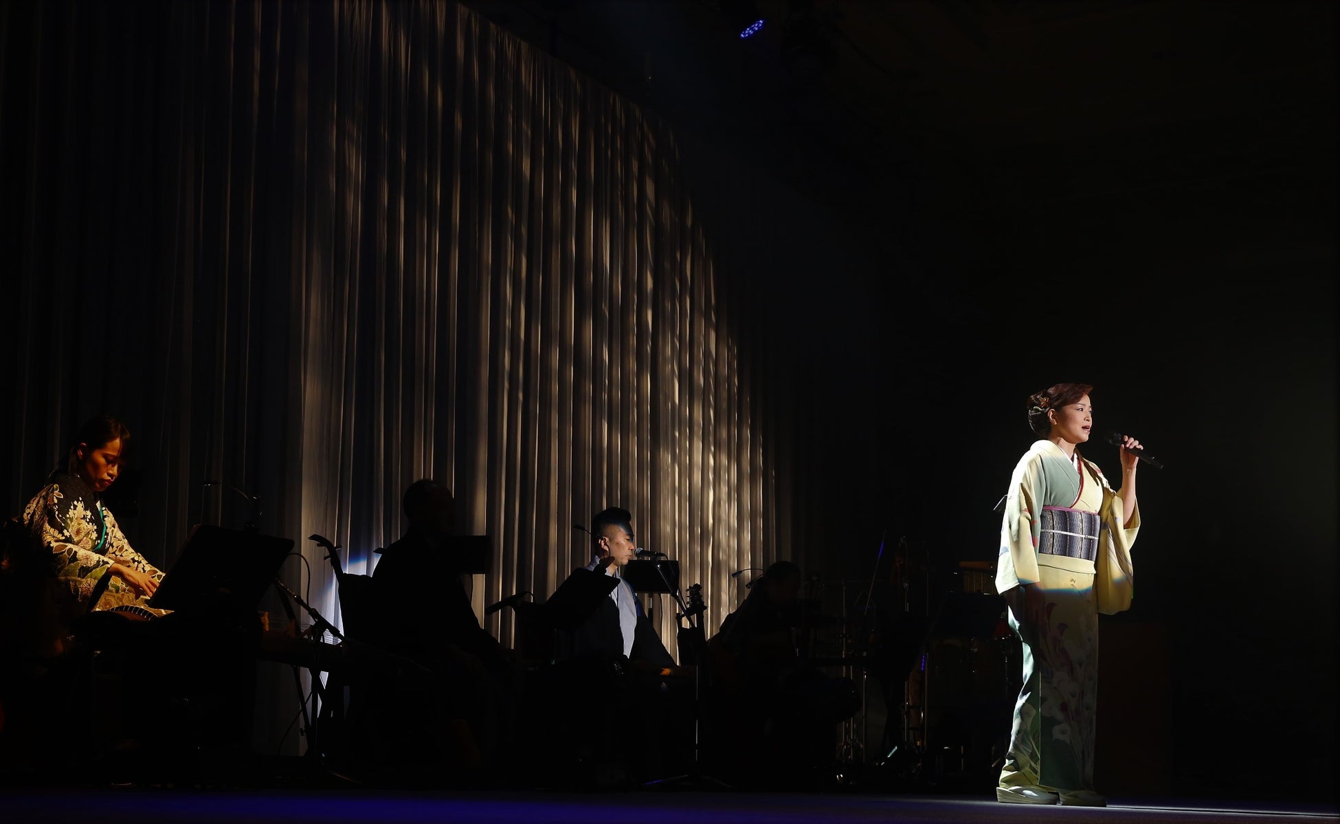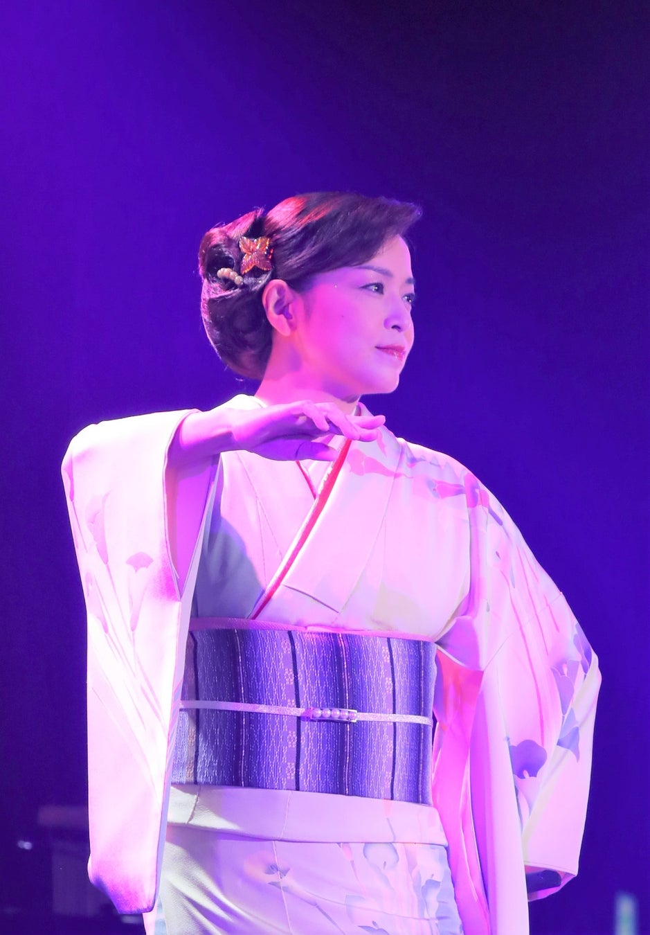 普段のコンサートとは違い、自身の芸能人生を辿る構成で開催された今回のショーは、意外にも詩吟「武田節」で幕を開け、詩吟入り「ほたるのふる里」、民謡入り「郡上の詩」と伝統芸能をMIXさせた自身のオリジナル曲を披露。続いて長唄「小鍛冶」では三味線の弾き語りを披露。前半最後の曲は自身の母への想いを重ね合わせたオリジナル曲「淡墨桜(うすずみざくら)」に自身作詩の詩吟を挿入、演歌と詩吟を見事に融合させ歌い上げた。詩吟、民謡、長唄と石原詢子の持つ日本芸能へのリスペクトが大いに感じられ、聴き入っていた観客からは惜しみない拍手が沸いた。