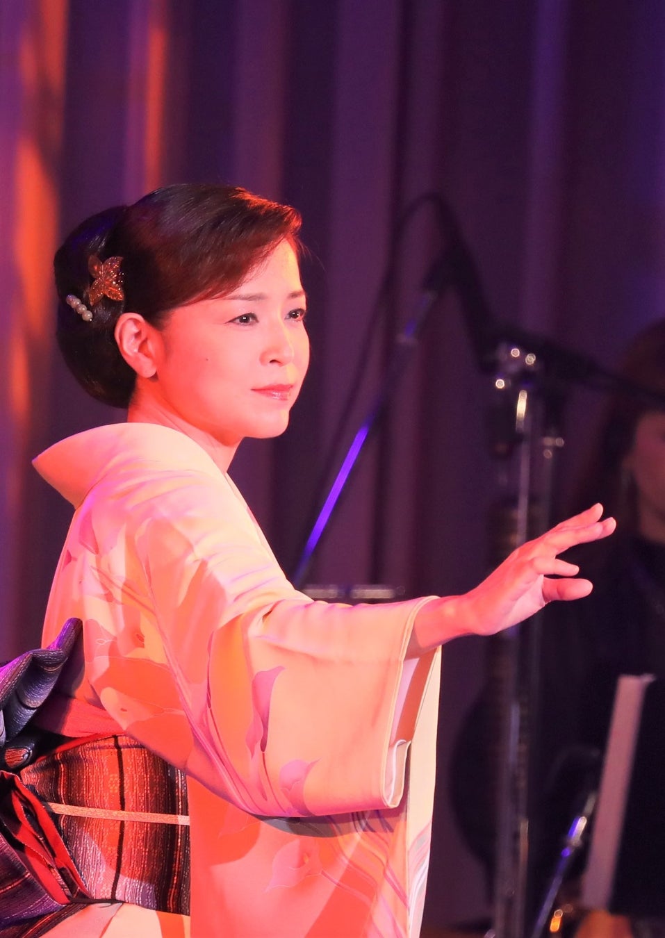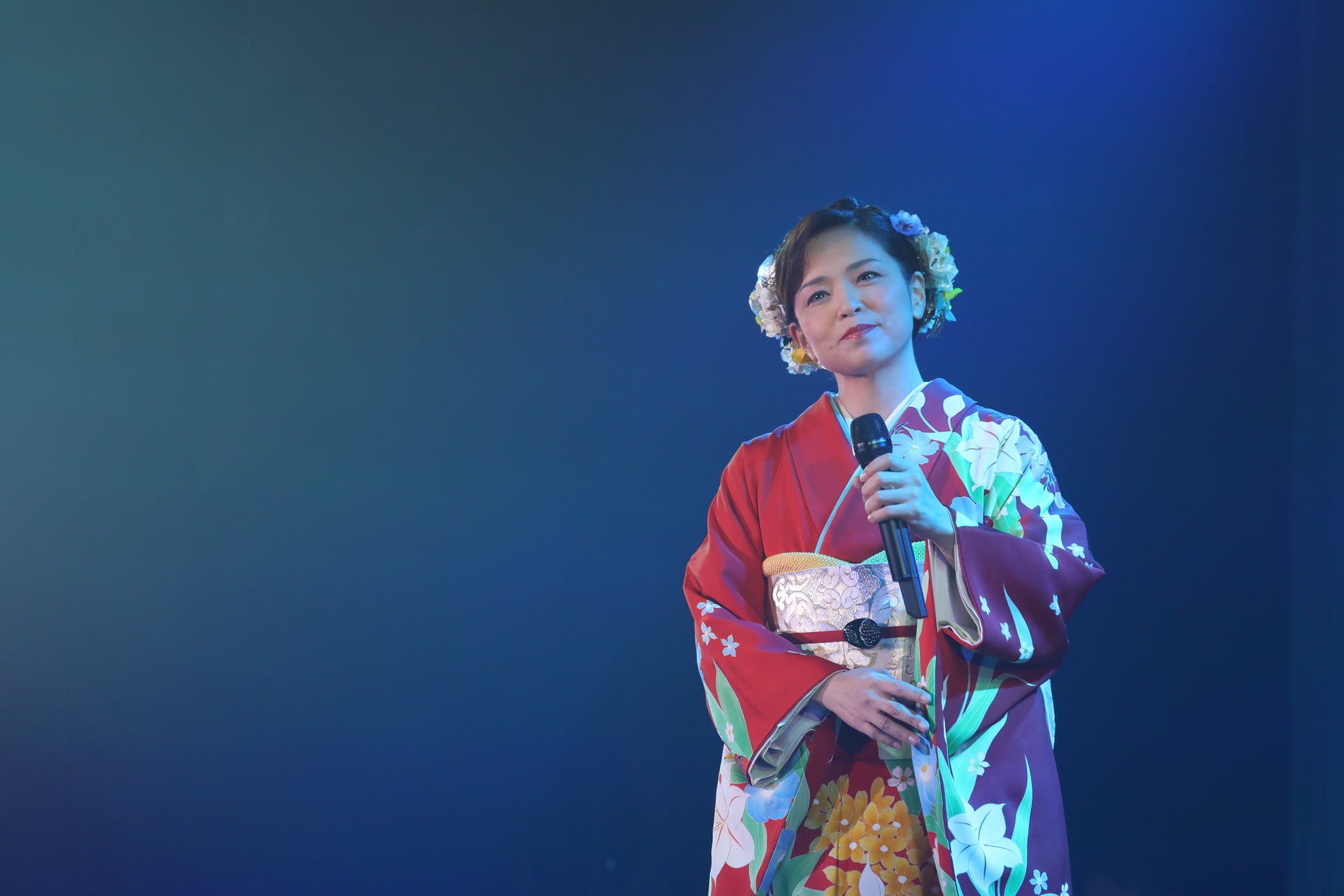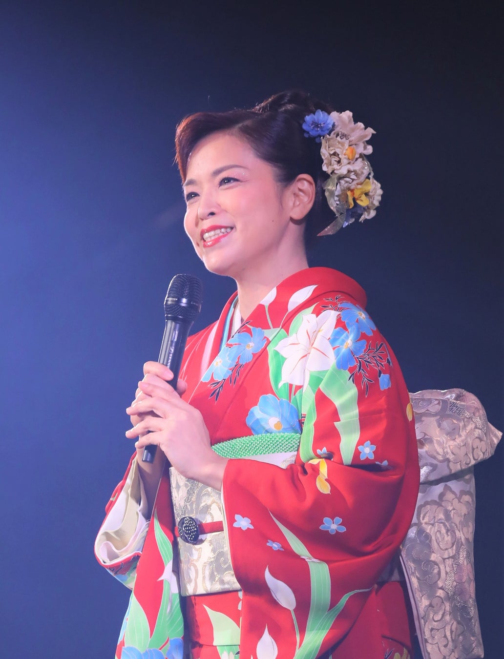 終演後、「コロナ禍の辛かった気持ちを今日のディナーショーで吹き飛ばすことができるくらい楽しかったです。お越しくださった皆様のぬくもりに包まれなら気持ちよく歌わせて頂き幸せでした。初挑戦の三味線と長唄は60点かな?(笑)長唄は4ヶ月、三味線は2年半というお稽古期間でダブルで初挑戦でした。歌いながら弾くのはやっぱり難しいですが、とても楽しく弾けました。」と語った石原詢子。