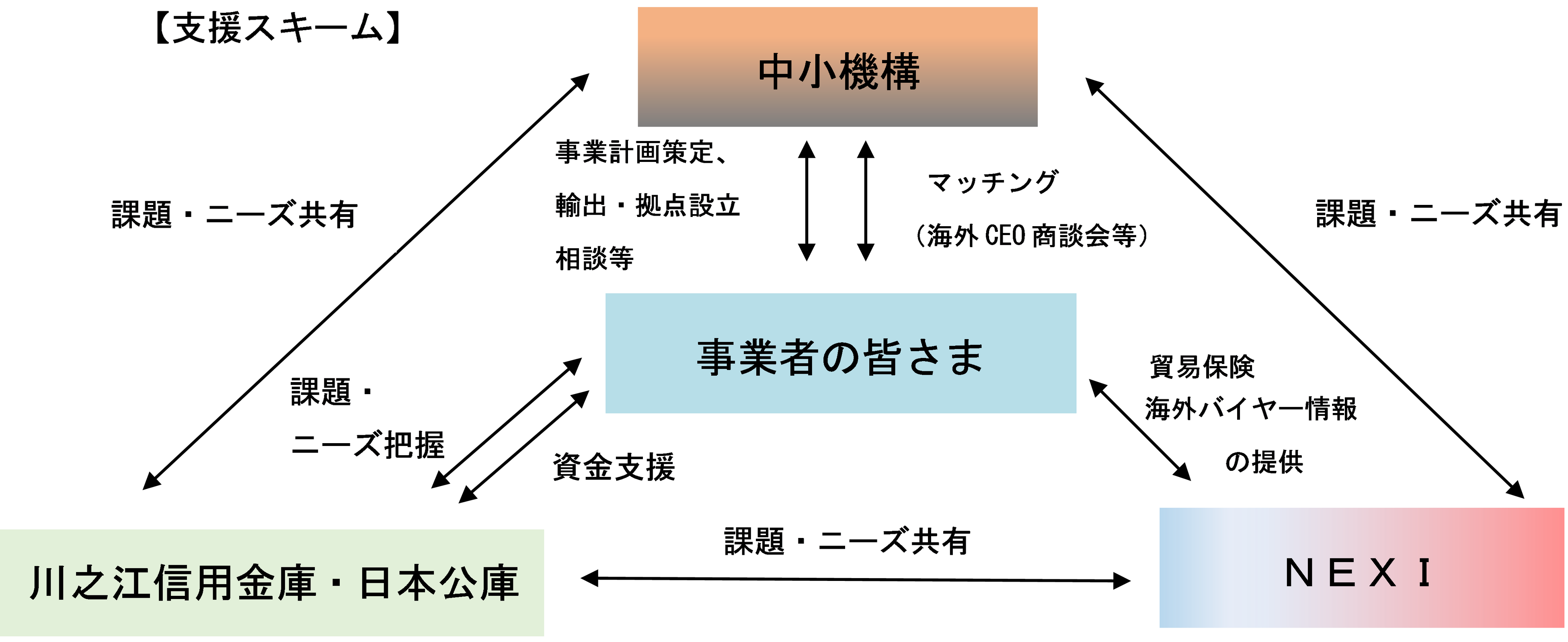 「海外ビジネス支援パッケージ」(以下「本スキーム」)は、海外への販路開拓・拡大等を図るうえでの様々な課題に対する解決支援を行い、円滑な海外展開の実現につなげるため、中小機構、日本公庫及びNEXIが令和4年12月に構築したものです。