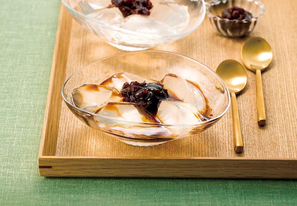 スプーンですくうだけでわかる、ぷるぷるの天然水ゼリー。「つるん」とお口にいれると「とろり」とくちどける“一瞬の涼”をお楽しみいただけます。ひんやり冷やして、北海道産の小豆あんと沖縄産黒糖使用の黒蜜をかけてお召し上がりください。