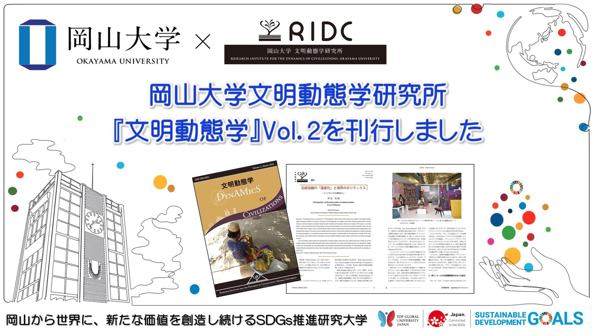 国立大学法人岡山大学(本部:岡山市北区、学長:槇野博史)の文明動態学研究所(RIDC)は、2021(令和3)年に開所された岡山大学で4つ目の研究所であり、人文・社会科学系でははじめての研究所です。RIDCでは人類と文明の動態に関連する諸分野の研究交流を目的として、学術雑誌『文明動態学』(電子版)を発行しており、2023年2月20日にvol.2を公開しました。
