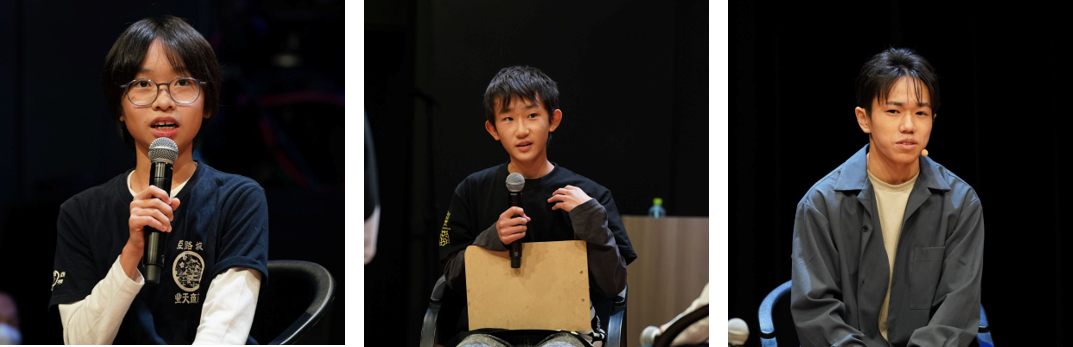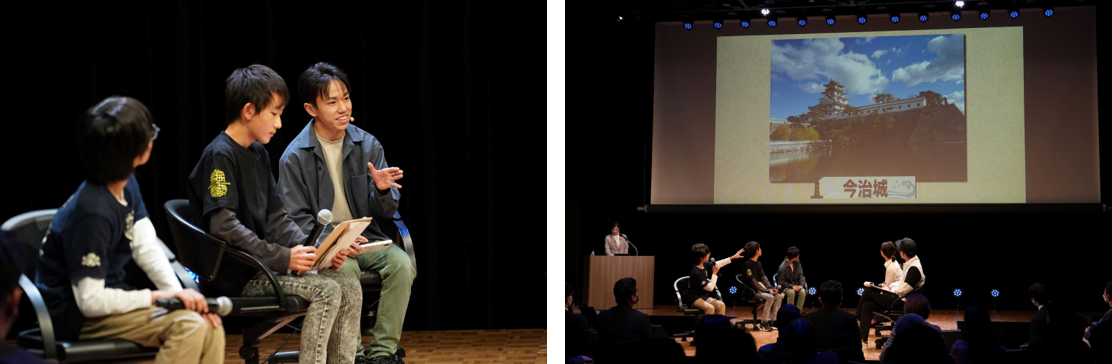 まず、中学1年生のお城博士 栗原響大くんは、海城(うみじろ)と呼ばれ海沿いに位置していた「今治城」を例に挙げて、天守が味方の船にとってシンボル的な役割だった歴史を解説し、灯台との多くの共通点を紹介しました。続いて、中学2年生の海博士 萩原一颯くんは自身が大好きな魚を紹介しながら、魚採集時に近くにあった野島埼灯台に行ったエピソードを話してくれました。話を聞いたパネリストのたかまつ氏は「海の生き物に興味を持たれているので、そこから灯台との関わりについても教えてもらえたら。」と期待を語りました。