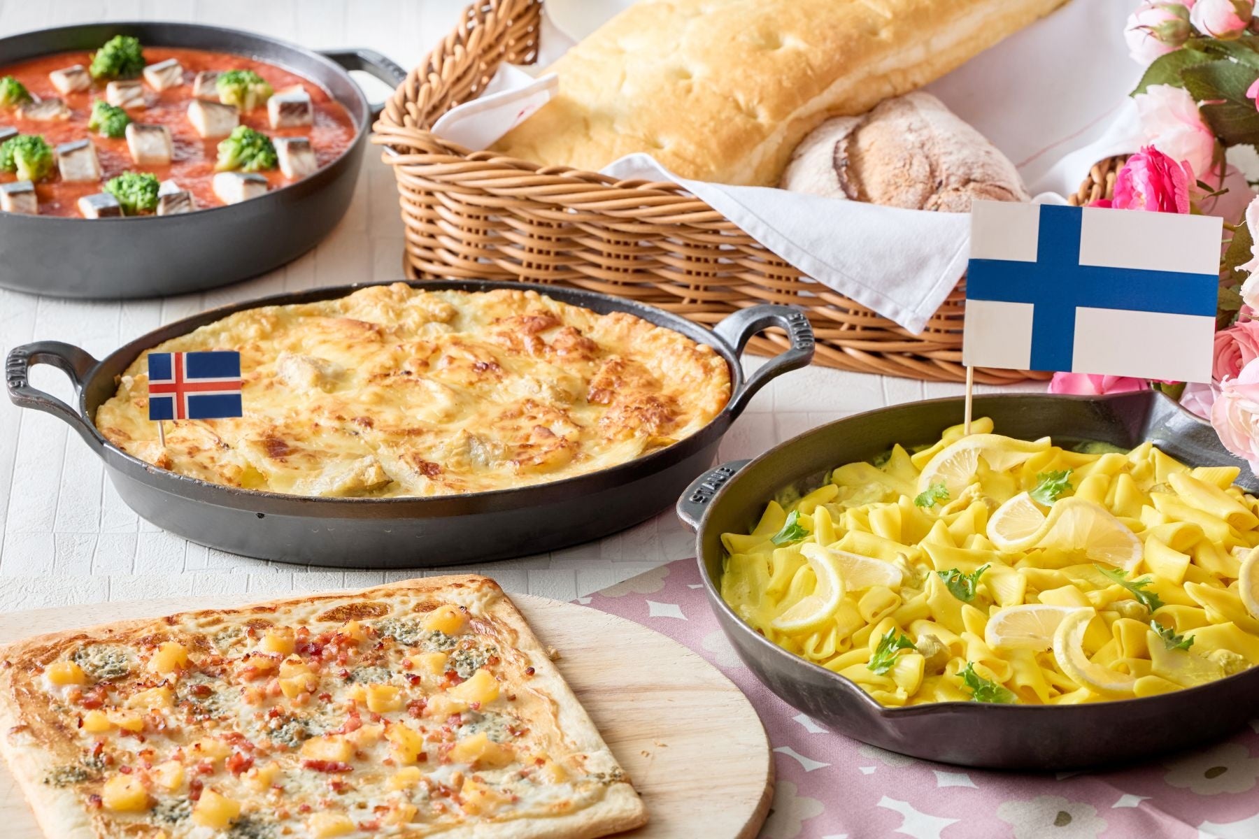 チキンとヨーグルトのフィンランド風カルボナーラ/プロックフィスクル 鱈とじゃがいものシチュー グラタン仕立て/秋田寒麹トマトソースとサワラの北欧風オーブン煮/エープルフラシュクとデンマーク産ダナブルーのチーズピッツァ
