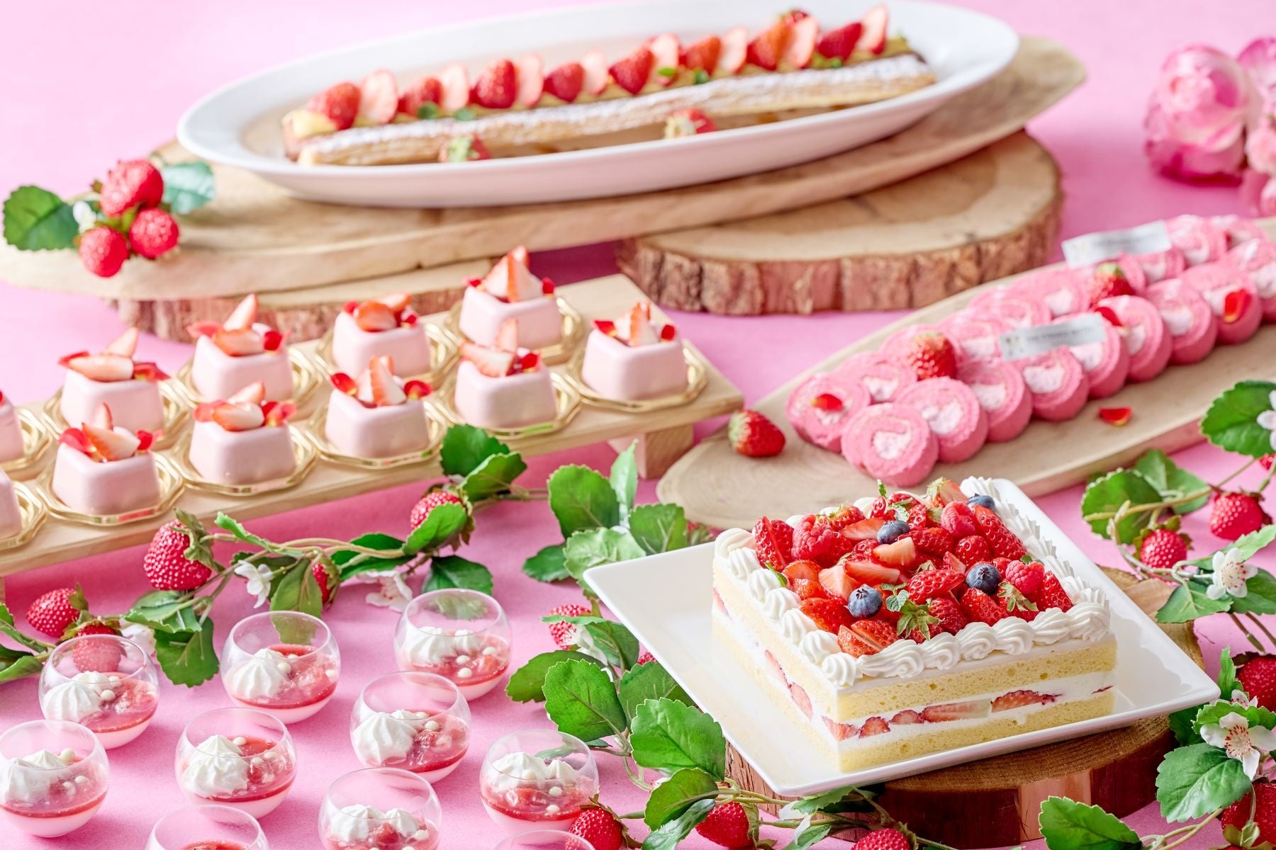 いちごのショートケーキ/いちごのバトンパイ/いちごのロールケーキ/桃と紅茶のフィナンシェ/ヨーグルトのムース/いちごのパンナコッタ/いちごのムース/ベイクドチーズケーキ/桃のジュレ/パンケーキ