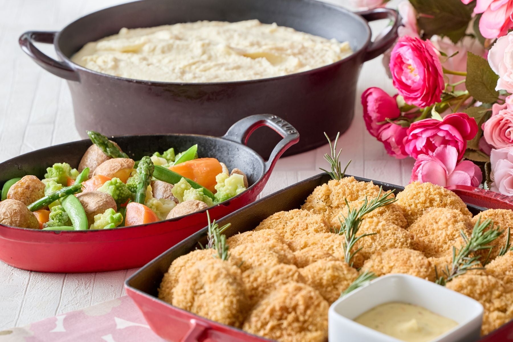 クリスタルソルトで食べる旬の野菜ロースト(爽やかレモンソルト、薫るローズマリーソルト、ピリッとレッドチリソルト、ヘルシー&ビューティー竹炭ソルト)/マッシュポテト/いがめんち 醬油マヨ
