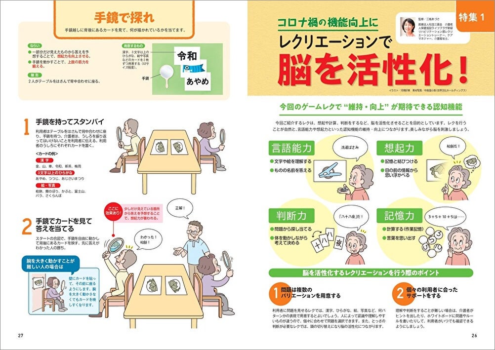 今号では、想起や計算、判断をするなど、脳を活性化させることを目的としたレクを特集。手鏡越しに背後にあるカードを見て、何が書かれているか当てる「手鏡で探れ」や、カードに描かれたものと同じものを素早くつかみ取る「同じものつかみ取り」など、楽しみながら脳を刺激するレクを取り揃えました。レクを行うことで、自然と言語能力や想起力といった認知機能の維持・向上につながります。