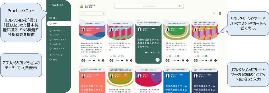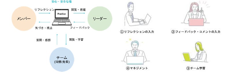 このアプリは相互学習をチームの仕組みとするために、「リフレクション」「対話」「フィードバック」「経験学習」を日々の業務に実装します。「Practice」がチームメンバーの人柄や気持ちを感じあえる場となり、お互いに高めあい、課題解決を支援しあう安心安全なコラボレーションプラットフォームとなります。