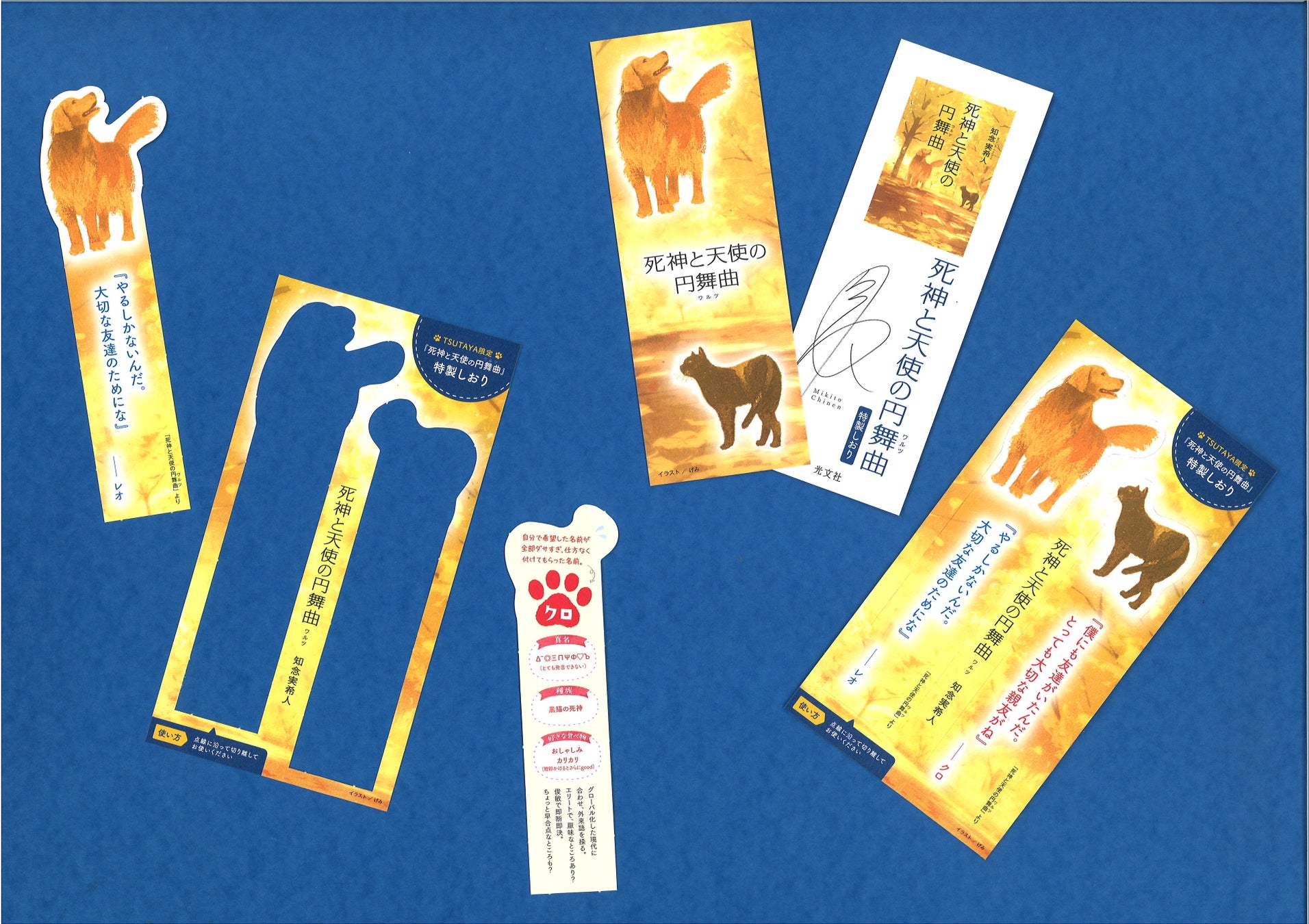 発売を記念して、人気イラストレーターのげみさんがシリーズ第1作『優しい死神の飼い方』、第2作『黒猫の小夜曲(セレナーデ)』(ともに光文社文庫)に引き続き手がけたカバーイラストを使った特製しおりを、全国のTSUTAYA対象店舗、紀伊國屋書店でご購入のお客様に配布することが決定いたしました。