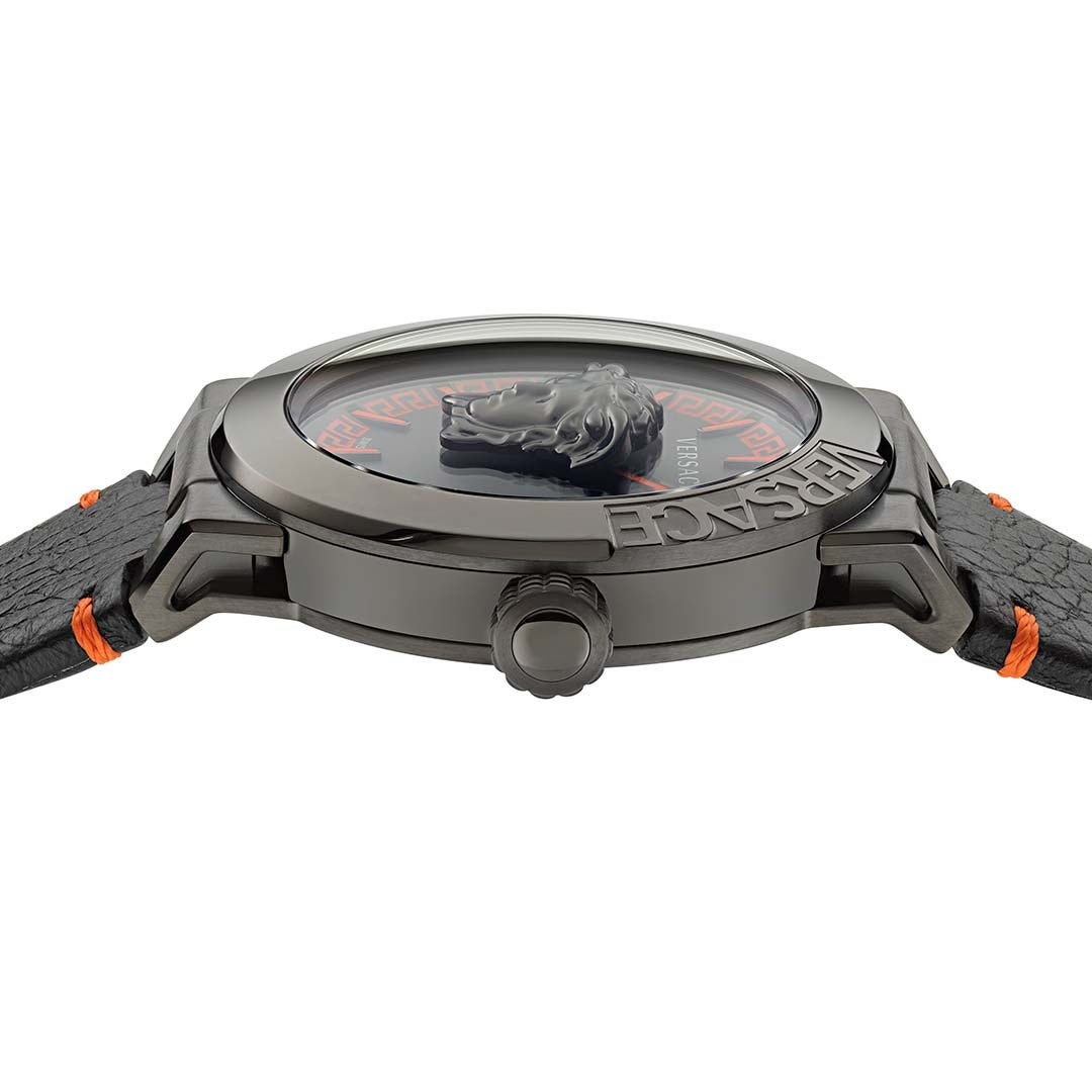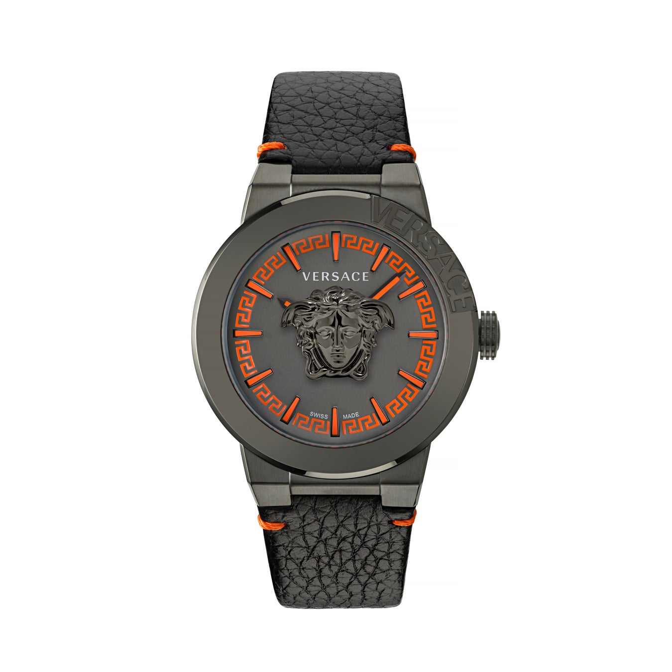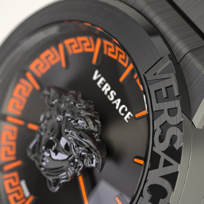 ドーム型の風防の中に、ブランドアイコンの「フローティングメドゥーサ」が浮かび上がるアイコニックなモデル。ベゼル右肩にはVERSACEの文字を刻み、すり鉢状の文字盤にはグレカ模様を立体的にデザイン。モダンなケースにブランドのエッセンスをまとめた、スポーティなモデルです。