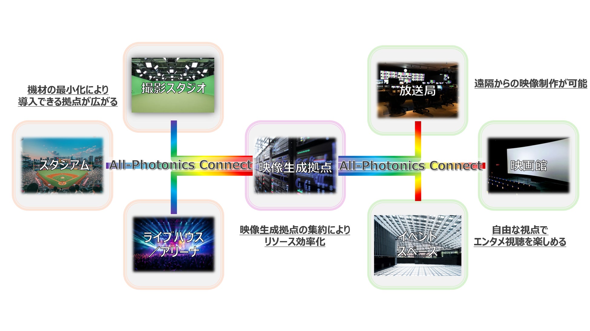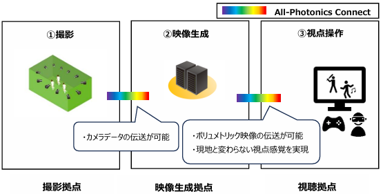 従来は撮影拠点でカメラデータ処理から視点操作・映像生成までの全ての工程を実施してきました。本協業では、撮影拠点、映像生成拠点、視聴拠点をそれぞれ All-Photonics Connect で接続します。 All-Photonics Connect により既存回線では伝送が困難な大容量のカメラデータを伝送し、視聴拠点からの自由視点操作において映像と視点情報を遅延やゆらぎなく処理するための検証を進めていきます。
