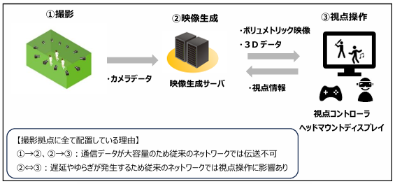 本協業により、撮影場所にとらわれず、遠隔地からでもボリュメトリックビデオの生成・視聴・操作が可能になります。これにより、撮影拠点(スタジアム等)に映像生成サーバを持ち込む必要がなくなり、機材配置の最適化によるコスト削減が期待できます。さらに、視聴者は遠隔地でもボリュメトリック映像を視聴・操作でき、好きな角度や視点から楽しむ新しいエンターテインメント体験が可能になります。