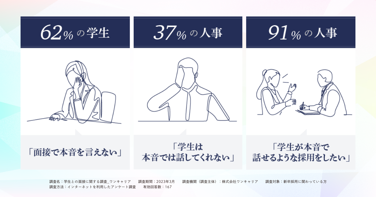 昨年行った調査(※1)によると、約6割の学生が「就活中、実際の本音や事実と異なる発言をしたことがある」と回答しています。「就活」という人生における大切な選択の機会を、失敗したくないという思いから本音を言えない学生が多いのではないでしょうか。目の前にいる採用担当者がどんな人かわからないこと、合否の理由がわからないことなども、自己開示を難しくしている要因のひとつであると考えています。
