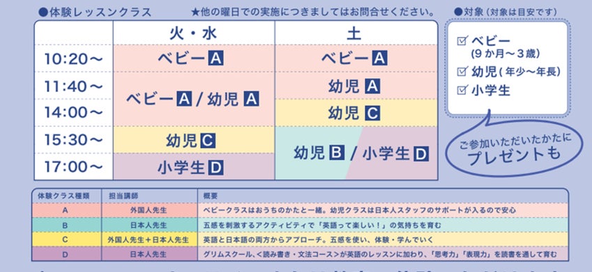 グローバル思考力特化校では、新コースを含む各年齢向けコースについて、オンラインまたは教室でご参加いただける体験レッスンを以下の曜日・時間帯にて開催します。