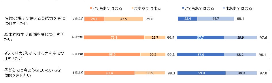 こうした背景もあってか、ベネッセ教育総合研究所が2023年に東京大学CEDEPとの共同研究として開始し、子どもの生活や保護者の子育ての様子を複数年にわたって調査した「乳幼児の生活と育ちに関する調査」では、2023年調査の結果において「実際の場面で使える英語力を身につけさせたい」と考える保護者が約7割に達していました。しかし、一方で、その結果以上に多くの保護者が「考えたり表現したりする力を身につけさせたい」「子どもには今のうちにいろいろな体験をさせたい」とも考えていることがわかりました。※2(下図)