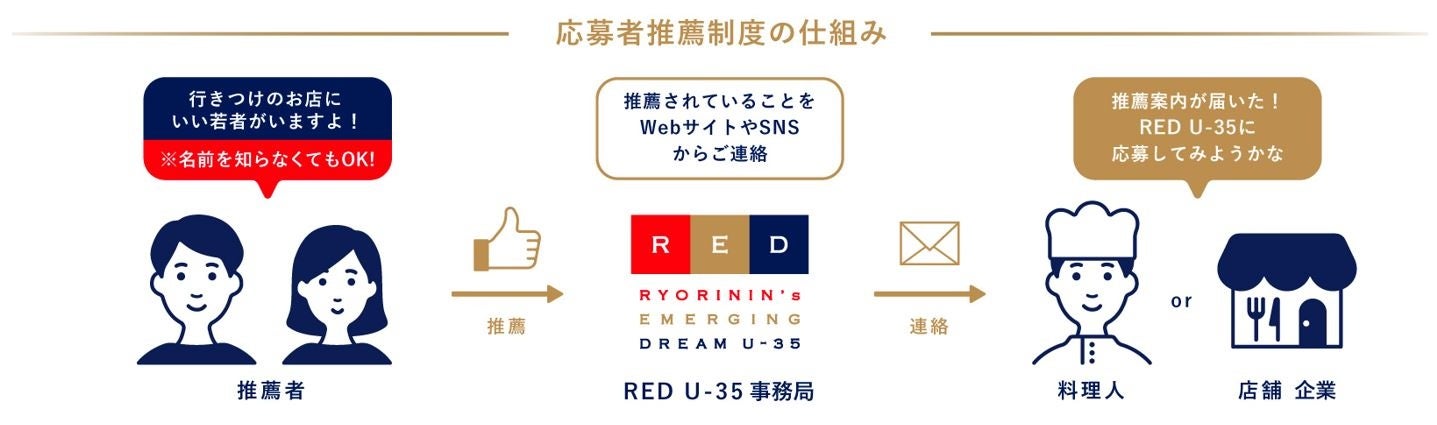 RED U-35では、「応募者推薦制度」を実施しています。この制度は、一般の方から行きつけのお店/近所のお店/お知り合いのお店などで「この料理人はスゴイ!」と思う35歳以下の若手料理人を推薦いただくものです。料理人の名前を知らなくても、「店舗名・地域」などの情報をいただくと事務局より、RED U-35の応募案内をお送りします。