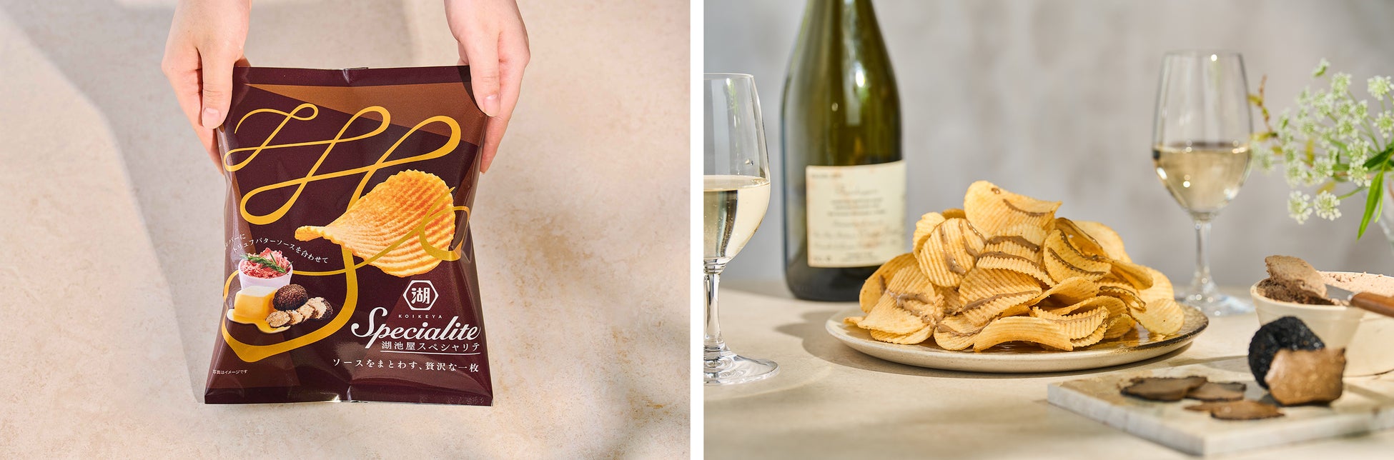 「スペシャリテ」とは、フランス料理において、その店のシェフが最も得意とする一皿のことです。日本のポテトチップスの老舗として、これまでとは違うポテトチップスの美味しい食べ方をご提案したいという想いから、「湖池屋Specialite」は誕生しました。国産じゃがいもの味わいを活かしたポテトチップスに、贅沢な味わいのソースをまとわせて食べる、まさに湖池屋の「スペシャリテ」と呼ぶに相応しい一品です。