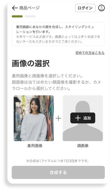 モデルの着用画像にあなたの顔を合成し、スタイリング後のイメージをご自身の顔で確認できるサービスです。自分の顔を合わせてみることで、ご購入前に「自分が着用したときの印象」を確認することができます。