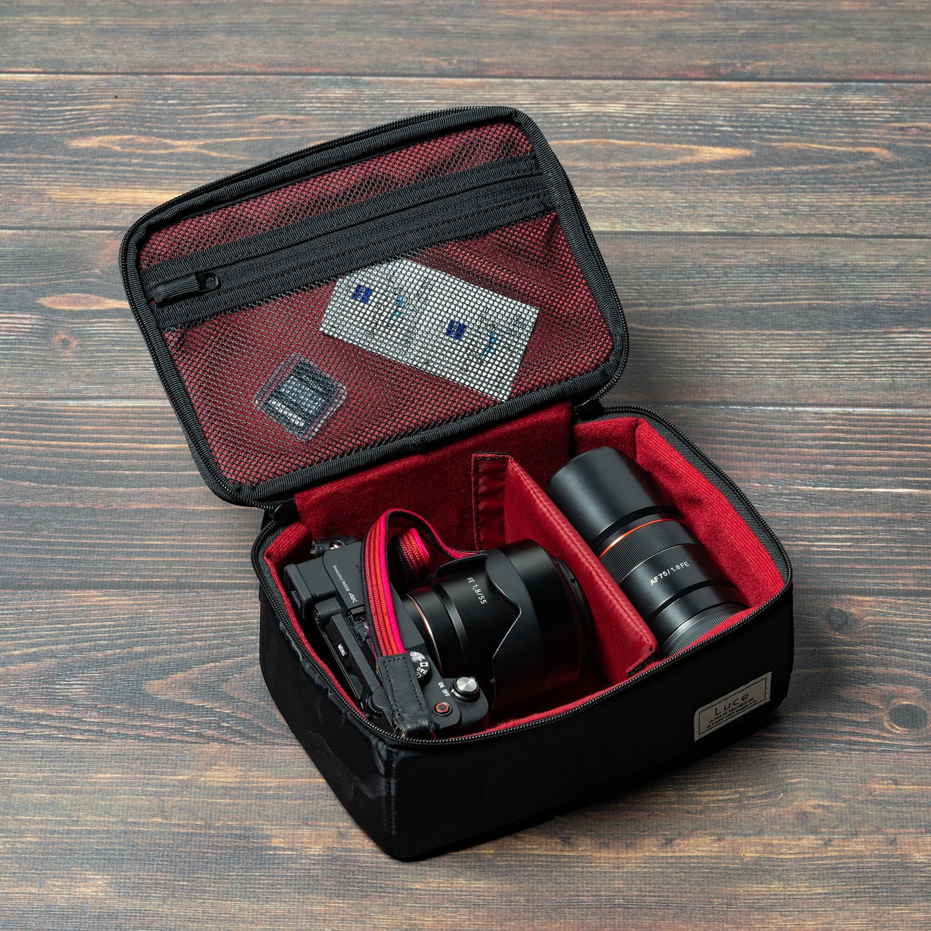 Sサイズは小型ミラーレスカメラ+小型レンズ1本+アクセサリー、Mサイズは小型ミラーレスカメラ+レンズ2本、Lサイズはミラーレスカメラ+レンズ2本を収納できます。