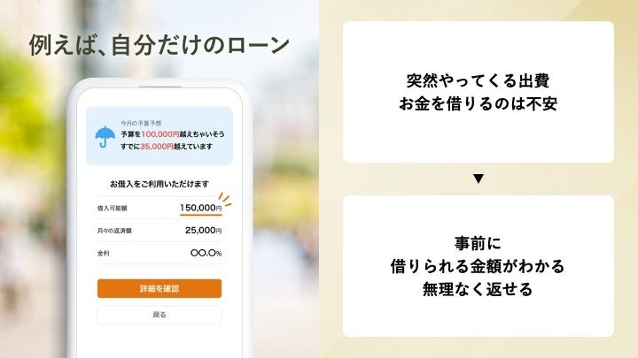 三井住友カードのクレジットカードや『Olive』の利用状況と、『マネーフォワード ME』が持つ家計管理データの分析により、ユーザーが借入れ可能な金額を事前にサジェストする機能。適切な借入れ額の設定により、突然の出費に対する不安を解消し、無理のない返済のサポートも行う。